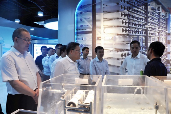 圖片:碧水源董事長文劍平(右一)向辛國斌副部長(右二)匯報我國膜技術市場的發(fā)展情況,