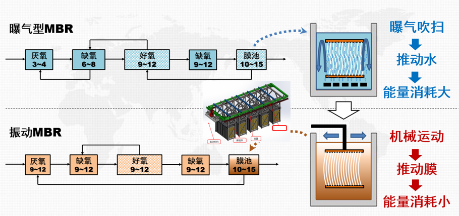 目前,碧水源研發(fā)的新一代的MBR技術——振動MBR,實現(xiàn)了能量消耗更小,氧的供應更加平衡,效果更優(yōu)。